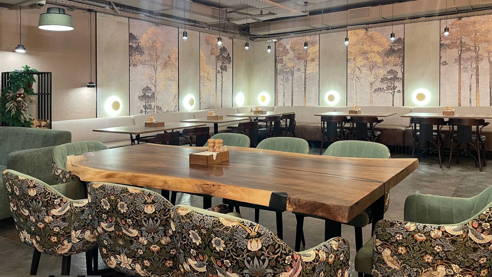 Друзья, недавно мы побывали в загородном комплексе «Циолковский», который расположен в живописном уголке Самарской области. Там открылся новый ресторан «Вкус Огня», и мы очень рады, что наша экологичная продукция стала частью его интерьера. В ресторане использованы бесшовные обои ECO с изображением деревьев (Арт. 35878) - они прекрасно перекликаются с окружающей природой: свежим воздухом, сосновым лесом и ароматом хвои, что позволяет гостям полностью погрузиться в атмосферу загородного отдыха.